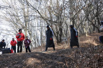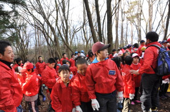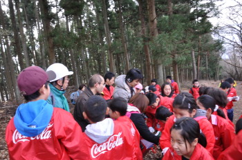 | それぞれ10班に分かれて、活動を始めました。 | はじめに間伐の仕方を教わりました。 植樹では、はじめ多めに苗木を植えます。その方が 苗木が競争しあって伸びていくし、下草も生えないの だそうです。苗木が大きくなると、元気な木を残して 曲がった木や、枝ぶりの悪い木は切り倒します。こうし て間伐をすると森に光りがさしこみ、苗木はどんどん 大きくなっていきます。 |