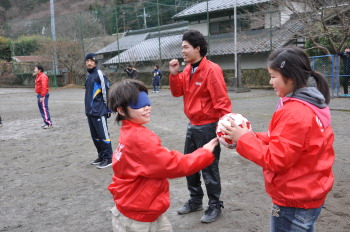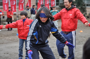 | 次はすずの音がするサッカーボールを使いました。 | すずの音をたよりにボールを持っている人をさがし 時間内に何回ボールタッチできるかをきそいます。 |