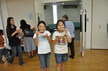 | みんな何回もおかわりしてしまいました。 | おみやげをたくさんもらった学校にもどりました。 |