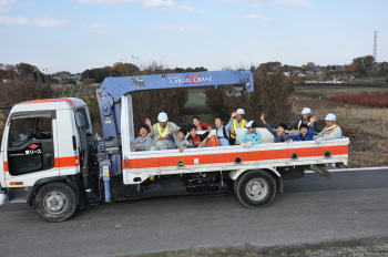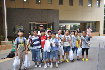 | 帰りは、トラックにのせてもらって大喜びでした。 | きれいに見える芝川ですが、たくさんのごみが 落ちていました。 |