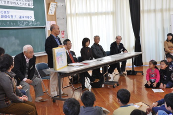 募金のとりくみも報告しました。 アルミ缶リサイクルでは9台の車イスを手にいれました。地域のお年寄りの施設に寄付をして交流をしています。 |