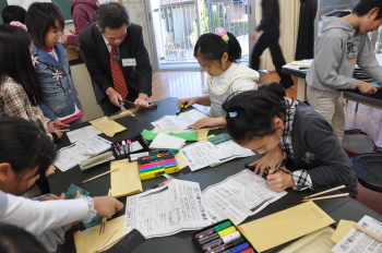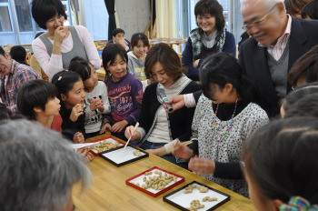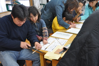 | 保護者のみなさんも挑戦しました。 | 子どもたちも盛大な応援をしてくれました。 お箸は仕上げを(株)兵左右衛門に仕上げをお願いし てあります。約4週間後に届く予定です。 楽しみに待っていてください。 http://www.hyozaemon.co.jp/index.html |