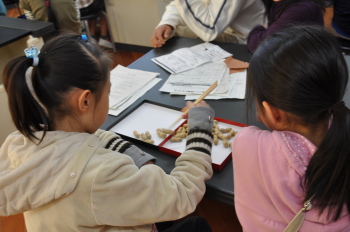 | 箸の使い方も、あらためて教わりました。 | みんな箸を手にとって「カチカチ」と先ではさめるよう に正しい持ち方を確かめました。 |