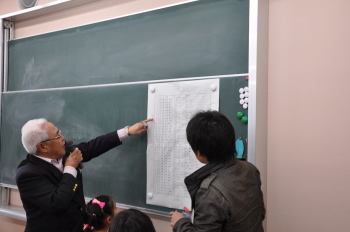 | 最後に 「箸ピー」ゲームです。 黒板に対戦表が貼られました! |