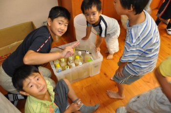 | 大型タンクでのマイエンザです。 みんな、おっかなびっくりのぞきこんでいます。 |