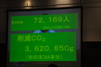 | 川口市民環境会議 代表 浅羽さんのあいさつ。 | 今年度のエコライフデーの成果が報告されました。 |