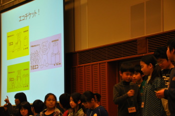 | いよいよ戸塚南小の発表です。 | エコチケットについての説明です。 戸塚南小ではエコチケットを使って、楽しくエコにとりくんでいます。紙のリサイクルで、リサイクルされたトイレットペーパーは2000個になります。トイレットペーパーはすべてリサイクルでまかなっています。 |