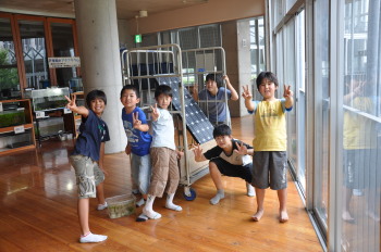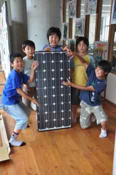 最後にネットの前、太陽光発電と一緒に記念写真。