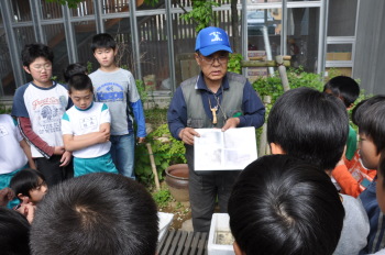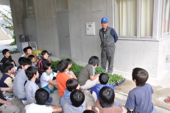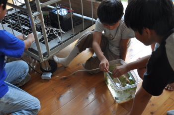 田中さんをお迎えしてホタルについて学習です。 箱のなかにはたくさんのホタルの幼虫がいました。