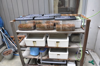 赤玉土の上に水ゴケをひいてできあがり。 幼虫はビオトープの池に放流するとともに、この虫カゴ