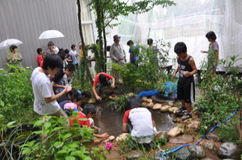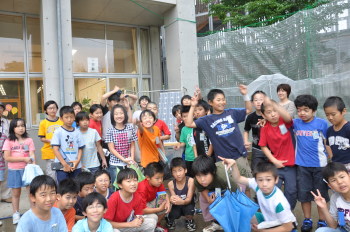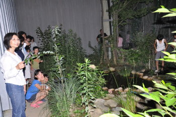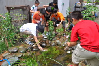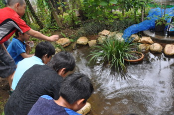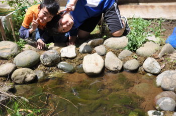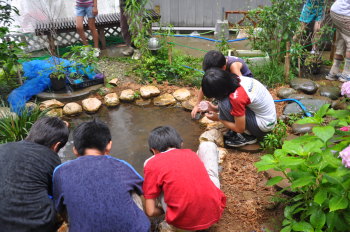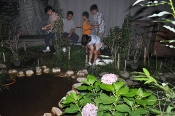 みんなで池に放流をしました。 これから2,3週間後に無事、成虫になって光ってくれる
