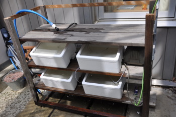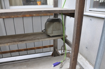 発砲スチロールの箱を切って、飼育箱を作成。 エアーを送るエアーポンプです。浄化槽の中古ポンプを