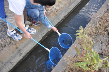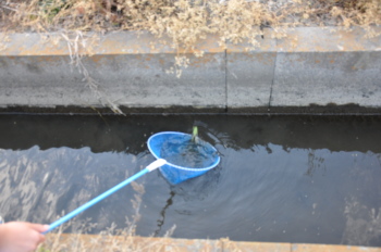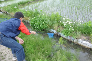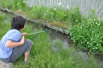 田んぼの用水の壁ぞいにくっついています。 網をのばして、こすりつけるようにします。