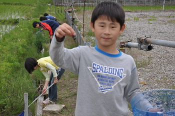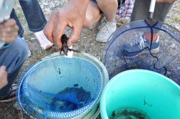 みんなで力をあわせて、よいしょ、よいしょ。 タニシのなかにザリガニもゲット