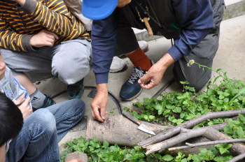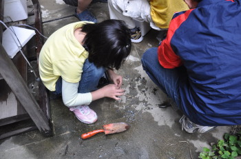 学校に帰って、タニシをわってなかを小さく切ります。 スポイトをつかってていねいに。