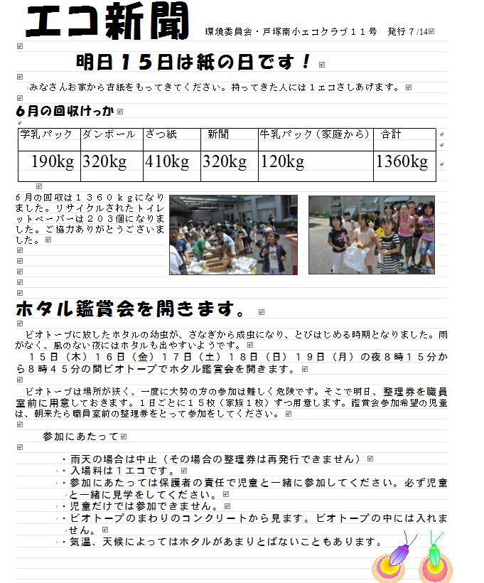 いたホタルの成虫が飛びましたが、今年は南小で幼虫から育てたホタルが成虫になりました。