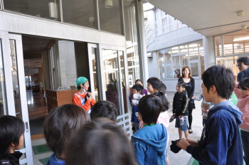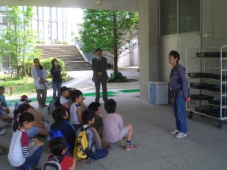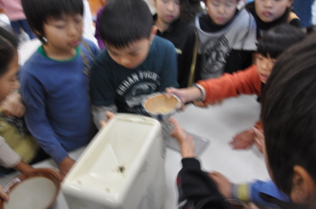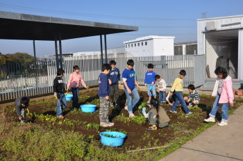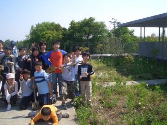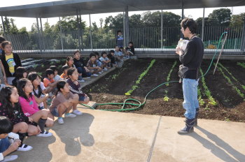 この日は、4年生が理科の授業に屋上のカブの生長の観察と共に、マイエンザ(環境浄化微生物)についても