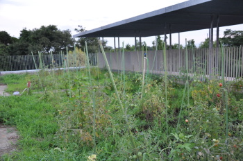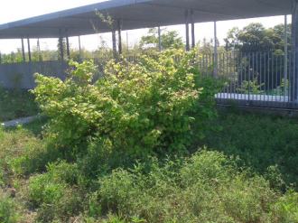 | 学校の屋上の雑草園になっていたところを、屋上農園として畑作りに挑戦しました。 雑草も木もこんなに繁っていました。 |