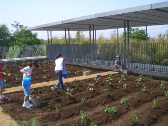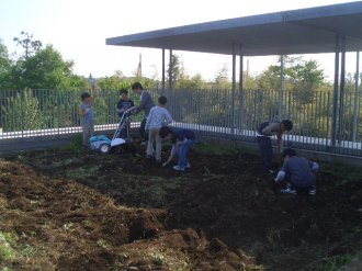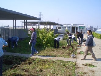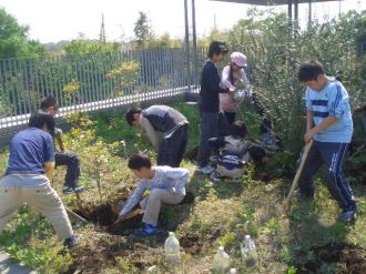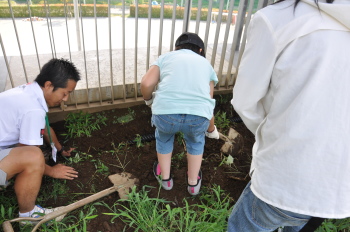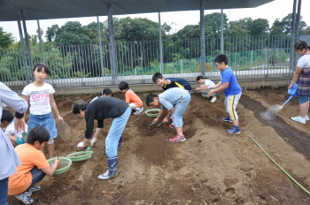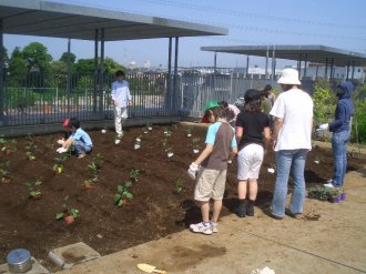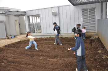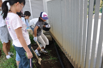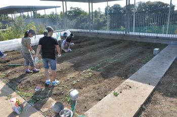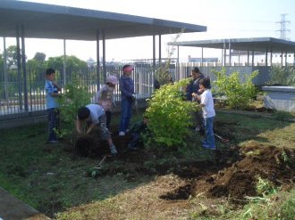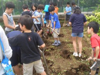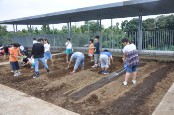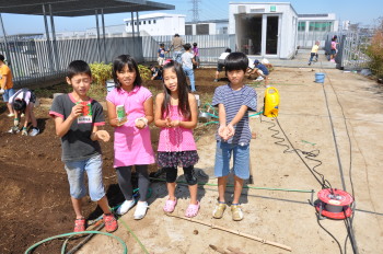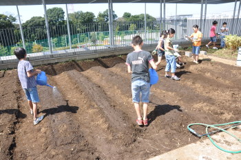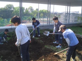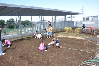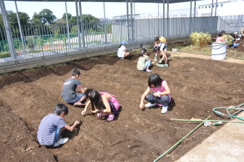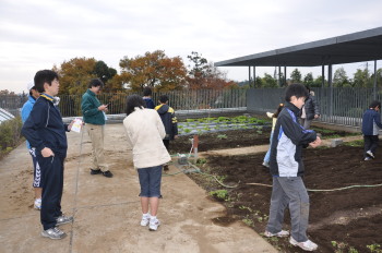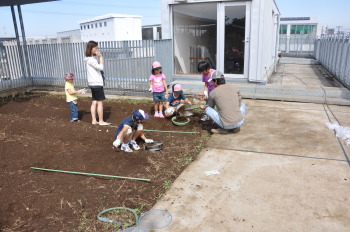 | みんなでスコップを持って、ほっていきます。屋上だから掘りすぎるわけにはいきません。おっかなびっくりのスタートでした。 |