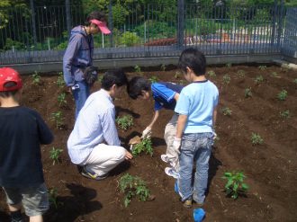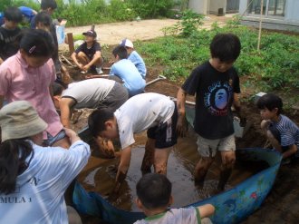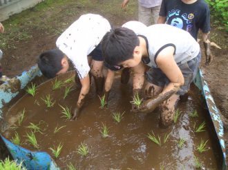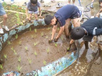 | 土を掘ったところに子供用プールを置きました。このプールが田んぼになります。ほった土を入れて、水をたしました。もう、みんなどろんこです。さっきまでの、おっかなびっくりの様子はどこかえいき、もうみんな夢中になって楽しそうにかきまぜていました。 そして、最後に稲の苗を植えました。 |