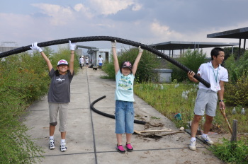 | 屋上とあって、泥を靴につけると、おりるときが大変 なので、靴にビニール袋をまいている子もいます。 |