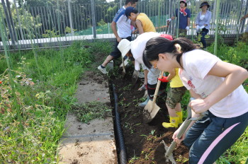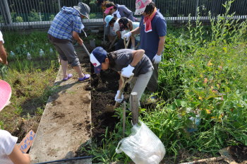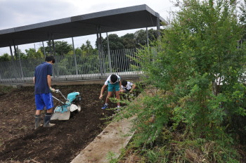 | 雑草園のまんなかにあったミヤギノハギなどの植物を植えかえました。深く掘ったところには土をもどしました。秘密平気!耕耘機も登場しました! |