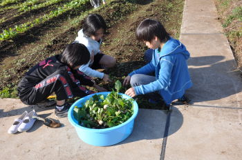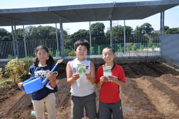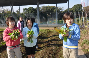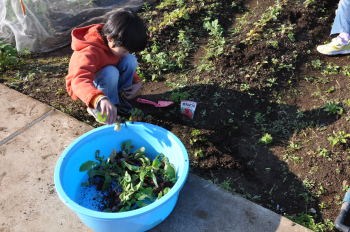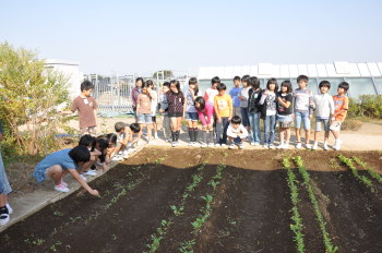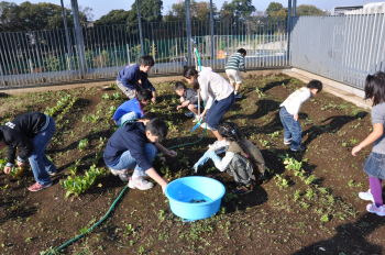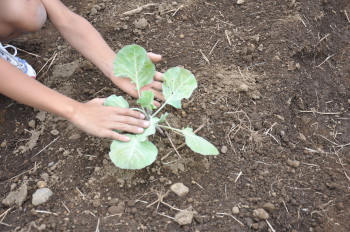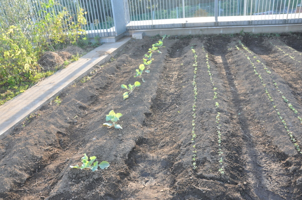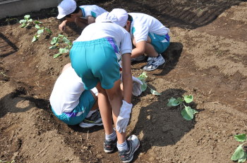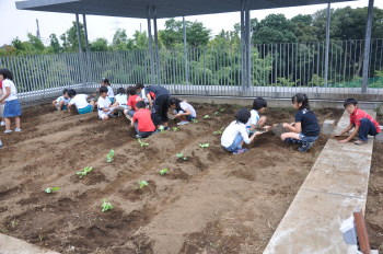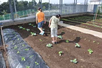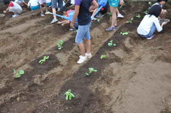 | 午後にはサポーターの坂井さんに来ていただき、 キャベツとレタス、大根、白菜を植えました。 |