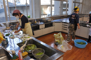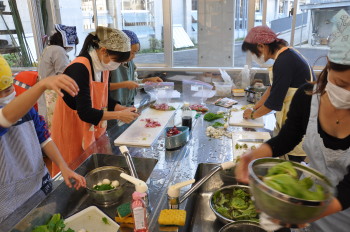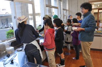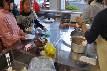 | 自分のつくった野菜はおいしいですね。 | さっそくおかわりの列ができました。 |