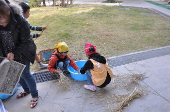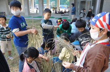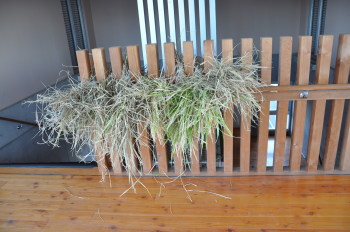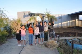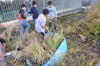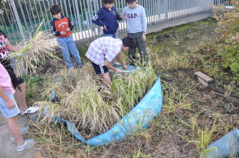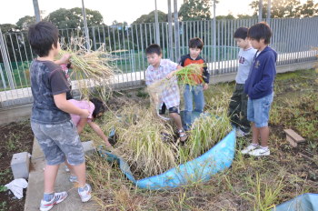 | しばらく、学校の屋上にこうやってほしておきます。 はじめての試みでしたが、何とかできました。 みんなで精米をして、収穫祭では、少しでも食べて みたいものですね。 |