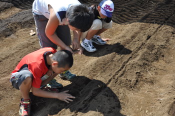 | みんなふるいをかけるのに夢中です。 | 「土って、こんなに気持ちいいんだね。」 |