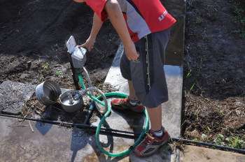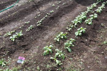 | 最後にていねいに水をかけてあげました。これから、どんどん伸びてほしいです。どれだけ実るか楽しみです。 ただ、今まで雑草園だったところです。雑草の種も根も残り、雑草がどれだけはえてくるのか心配です。 |