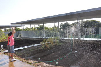 屋上、学校ファームの水はけがよくありません。雨がふるとしばらく水たまりのままです。どうも水はけが悪いようなので