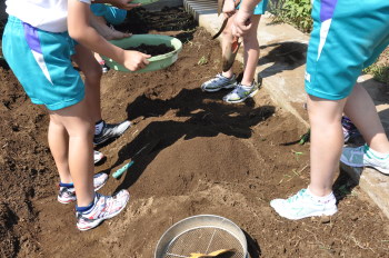 | ふるいにかけた土にさわると、「うわあ、土が気持ち いい」という声が子どもたちからあがりました。 |