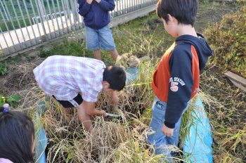 | 稲刈りの日がやってきました。 | 手ではぬけませんから、鎌を使います。 |