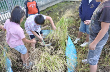 | 稲の根本を手でつかんで、けがをしないように鎌を ふってき切ります。 |