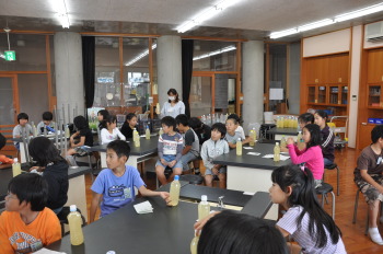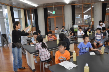 | 理科室で、その材料や作り方を聞きました。 | 手にとって、ふってみたり、においをかいだり、 不思議ですね。 |